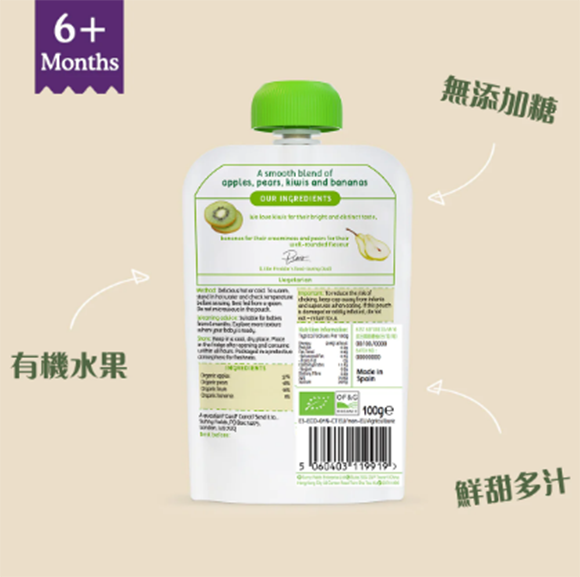 - 主要成分:有機蘋果57%、有機梨18%、有機奇異果16%、有機香蕉9%