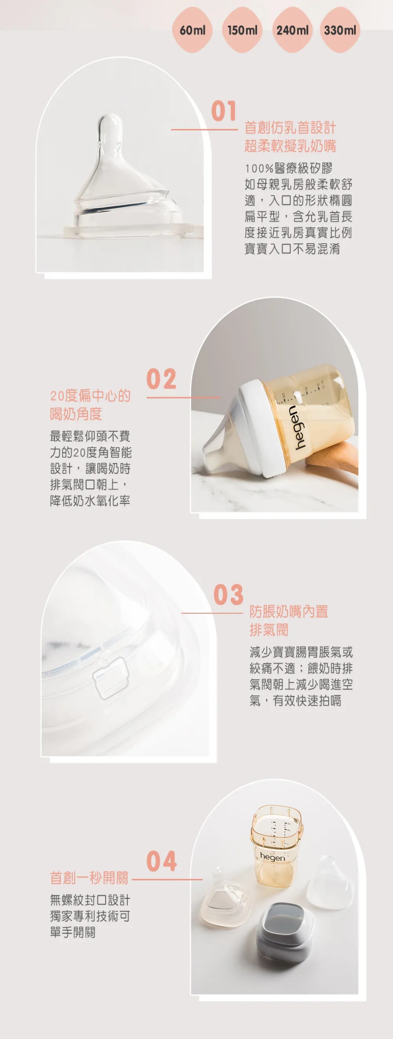 - 超柔軟真實擬乳奶嘴,斜側設計智慧奶嘴- 獨特的防脹氣排氣閥,首創秒開秒關專利設計- 超大寬口徑清洗更簡單- 卡扣式互連儲存蓋超整齊- 一瓶到底,隨心換蓋更方便- 容量:330ml- 奶嘴:防脹氣真實凝乳智慧奶嘴(快速)x1- 耐熱溫度:180℃