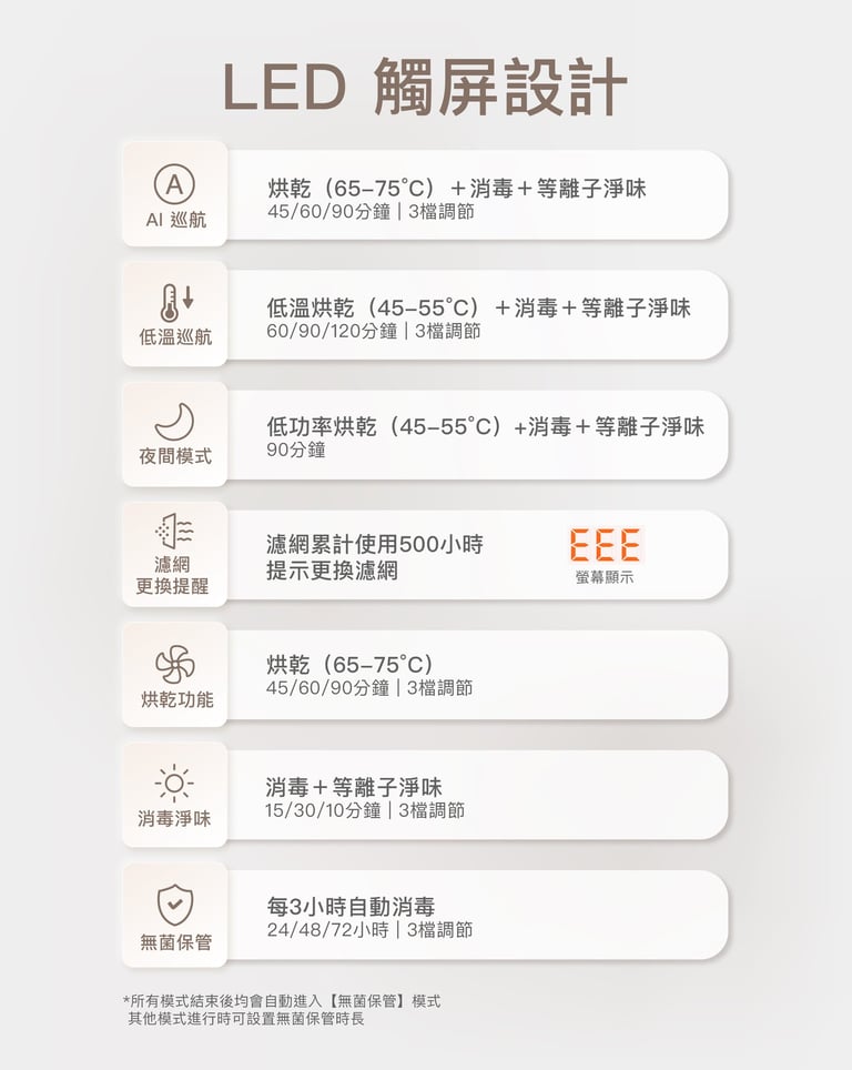 - LED觸控螢幕配備語音及畫面提示