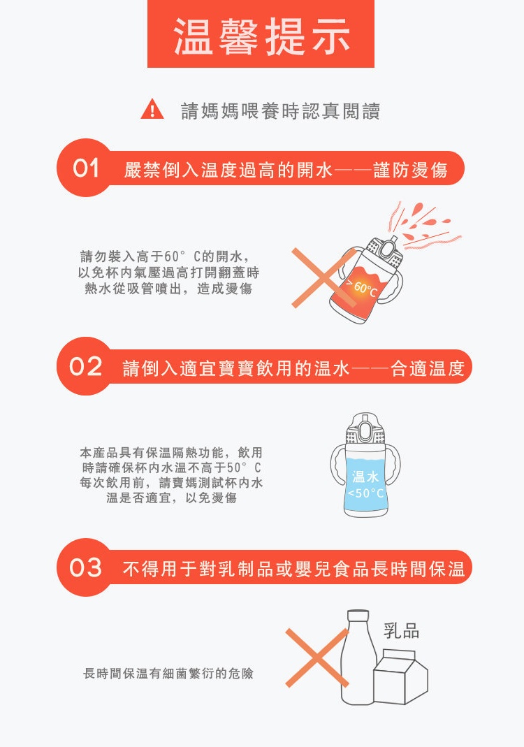 - 安全兒童鎖,裝有熱水時,可防止寶寶誤開,造成燙傷