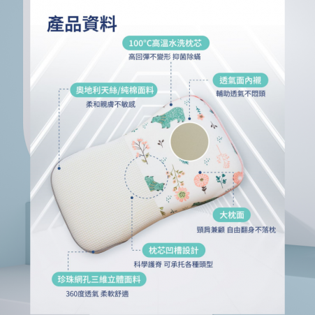 - 科學護脊,大面積枕面,方便翻身,不易落枕;珍珠網孔,3D立體面料,透氣舒適