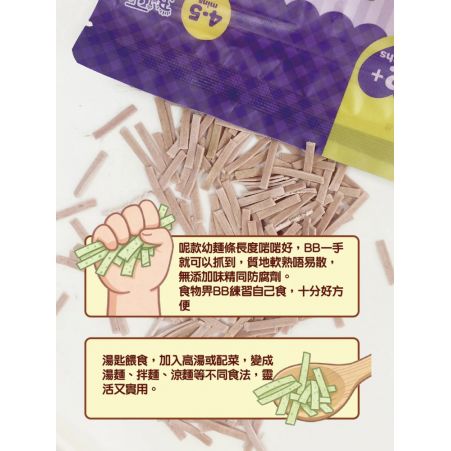 - 4–5分鐘即煮即食,口感軟滑易咀嚼,專為12個月以上BB設計