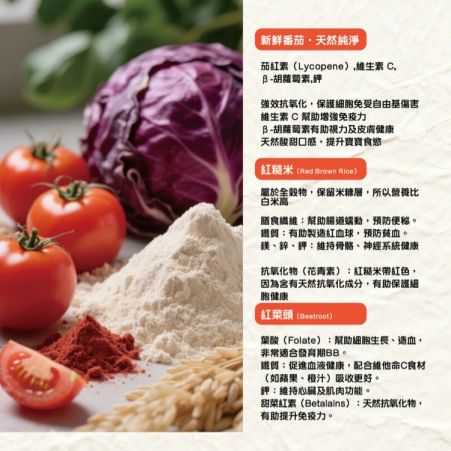 - 添加植物性 DHA(藻油)、維他命B1 及高膳食纖維,營養均衡又健康