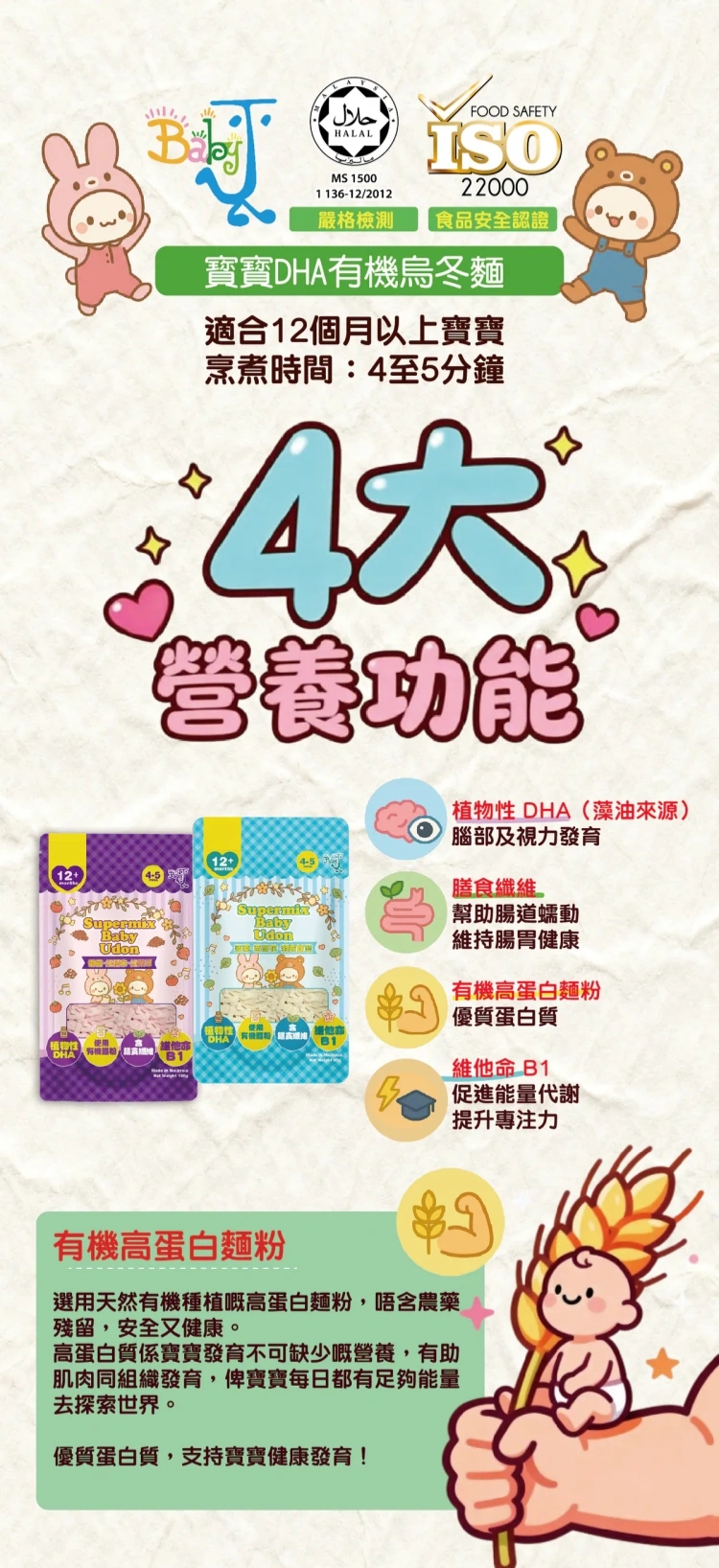 - 採用有機高蛋白麵粉製作,高蛋白質是寶寶發育不可缺少營養,