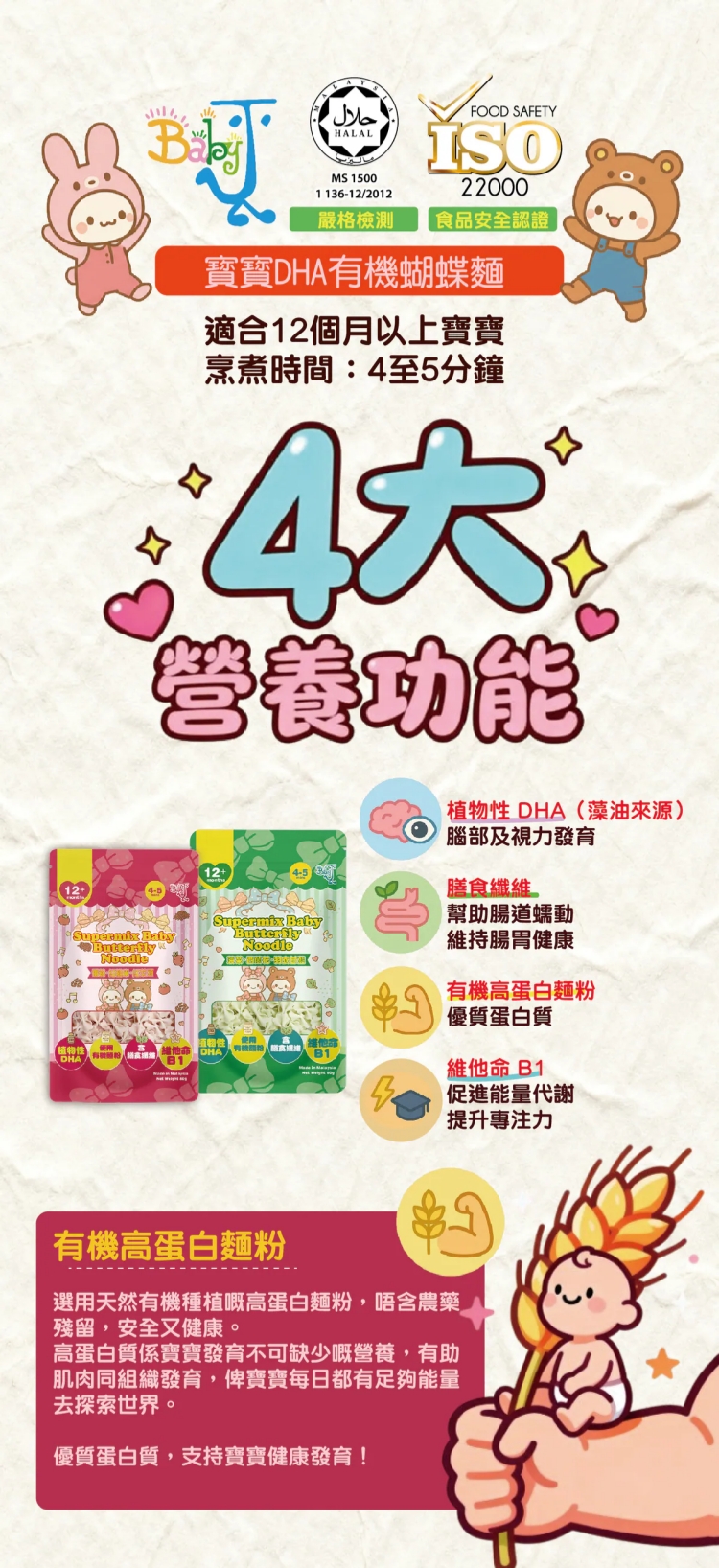 - 採用有機高蛋白麵粉製作,高蛋白質是寶寶發育不可缺少營養,