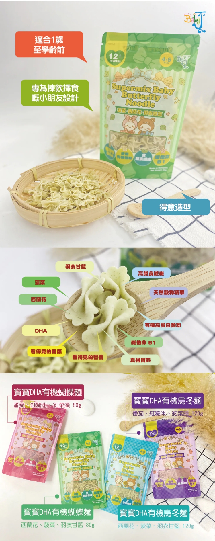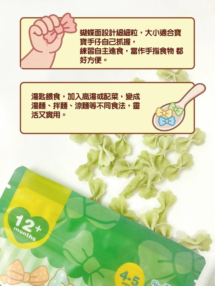 - 4–5分鐘即煮即食,口感軟滑易咀嚼,專為12個月以上BB設計