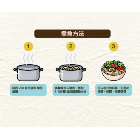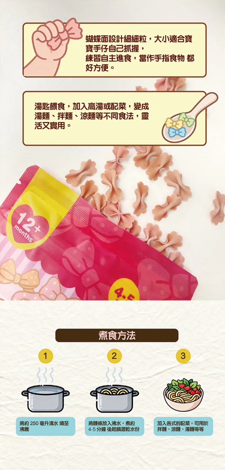 - 4–5分鐘即煮即食,口感軟滑易咀嚼,專為12個月以上BB設計
