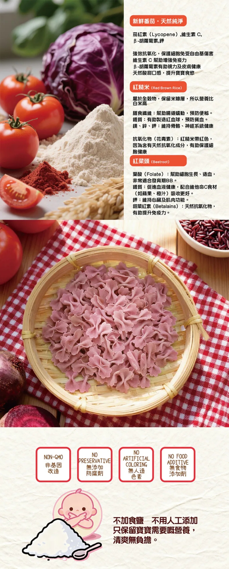 - 採用有機高蛋白麵粉製作,高蛋白質是寶寶發育不可缺少營養,