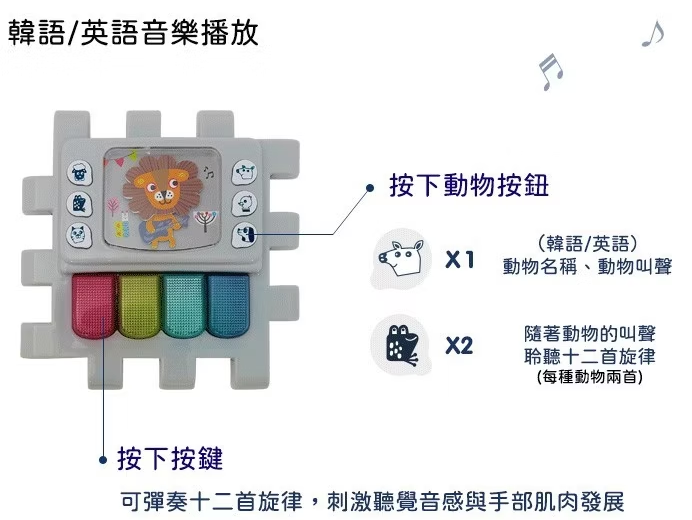 - 韓語/英語音樂播放:增加語言刺激與聽覺發展