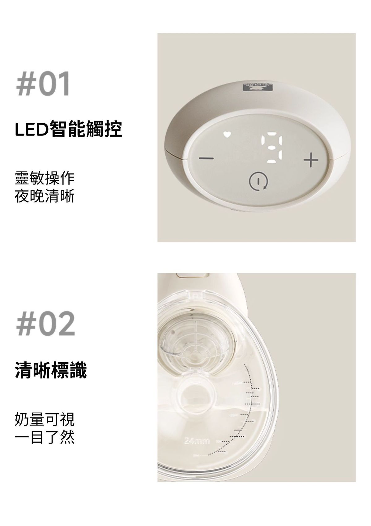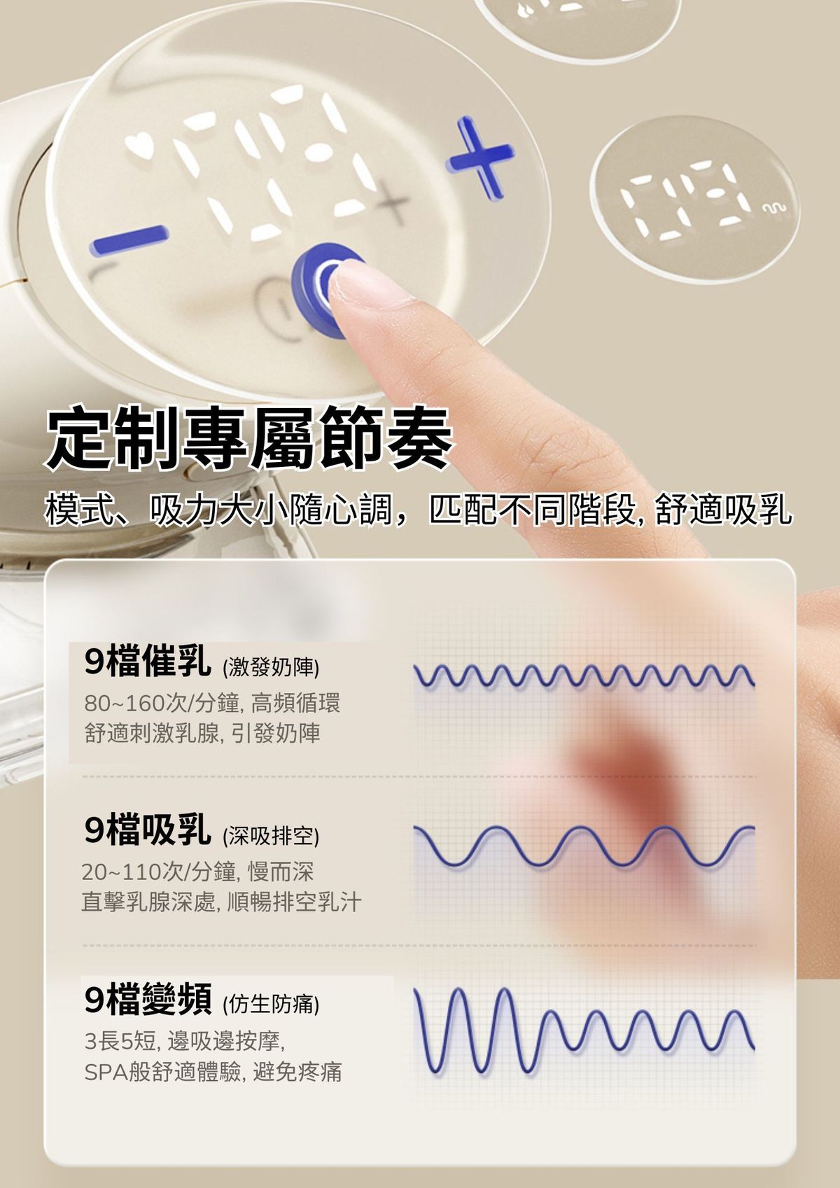 - 3 種模式:催乳/吸乳/變率模式操作
