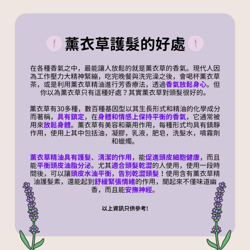 並有助平衡皮脂,預防油性髮質。薰衣草與有機香草的結合,達致鎮靜頭皮、