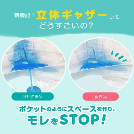 - 柔軟的吸收層可快速分散和吸收尿液,360°全方位防漏,有效應付稀便