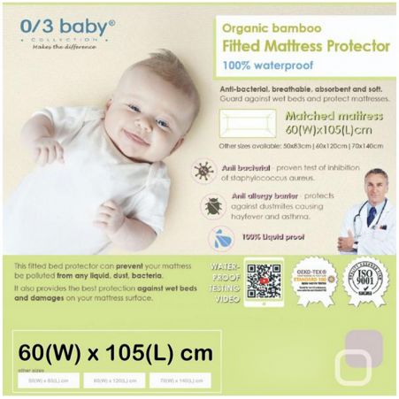 - 榮獲OEKO-TEX STANDARD 100認證,通過檢測有害物質- 通過SO9001品質檢驗,質素穩定良好- 100%防水、防止濕床情況- 採用有機竹纖維棉成分有助抗菌,經證明可抑制金黃葡萄球菌- 抗過敏,能防止花粉症- 彈性圍邊,更易套上床褥- 尺寸:60x105cm