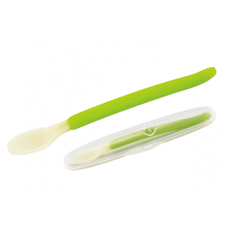 - 適用年齡:5個月起- 軟質素材不傷寶寶幼嫩的嘴巴- 側面的曲線設計,更容易舀起食物- 附收納盒方便攜帶又衛生- 耐熱:140度 - 材質:PP塑膠/TPE塑膠(餵食匙前端)- 清洗方式:可蒸氣/煮沸消毒- 外盒尺寸:3.8(寬) x 18.5(高) x 7(厚)cm