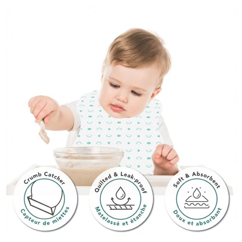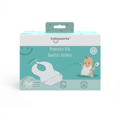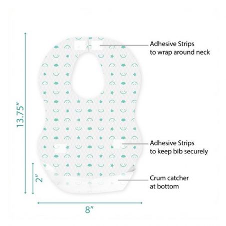 - 防水材料,防止液體滲透- 附有食物兜,避免食物液滴到衣服上- 強化材料韌性,可重新粘貼的頸部固定- 用完即棄,外出攜帶非常方便- 尺寸:35x20cm- 片數:24片