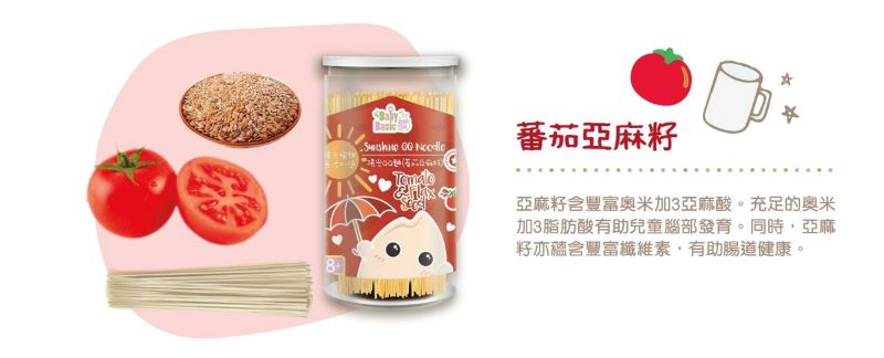 - 加強麵粉(添加鐵、維他命B1、B2)、蕃茄、亞麻籽、水