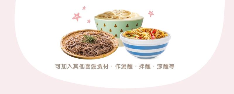 - 建議食法 :將約250ml清水燒至沸騰,再將麵條放入,煮約2-3分鐘後即成,可加入其他喜愛食材,作湯麵、拌麵、涼麵等