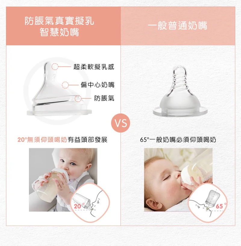 - 超柔軟真實擬乳奶嘴,斜側設計智慧奶嘴- 獨特的防脹氣排氣閥,首創秒開秒關專利設計- 超大寬口徑清洗更簡單- 卡扣式互連儲存蓋超整齊- 一瓶到底,隨心換蓋更方便- 容量:330ml- 奶嘴:防脹氣真實凝乳智慧奶嘴(快速)x1- 耐熱溫度:180℃