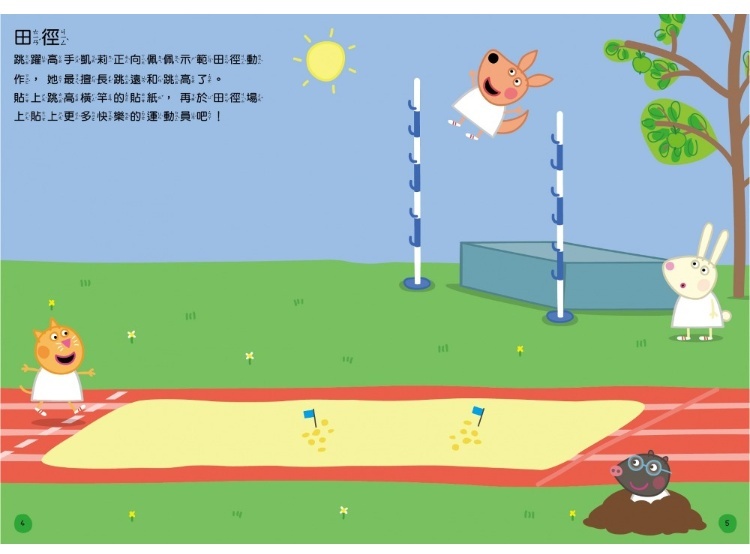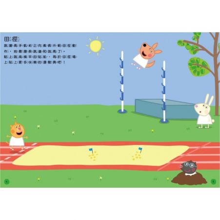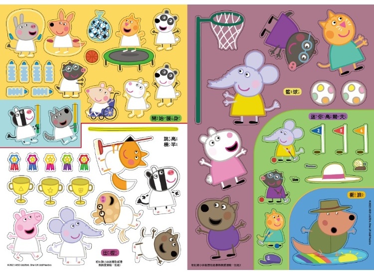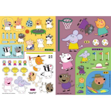 - 使用貼紙來裝飾各個運動場景,幫助佩佩和朋友踢足球、練體操和游泳