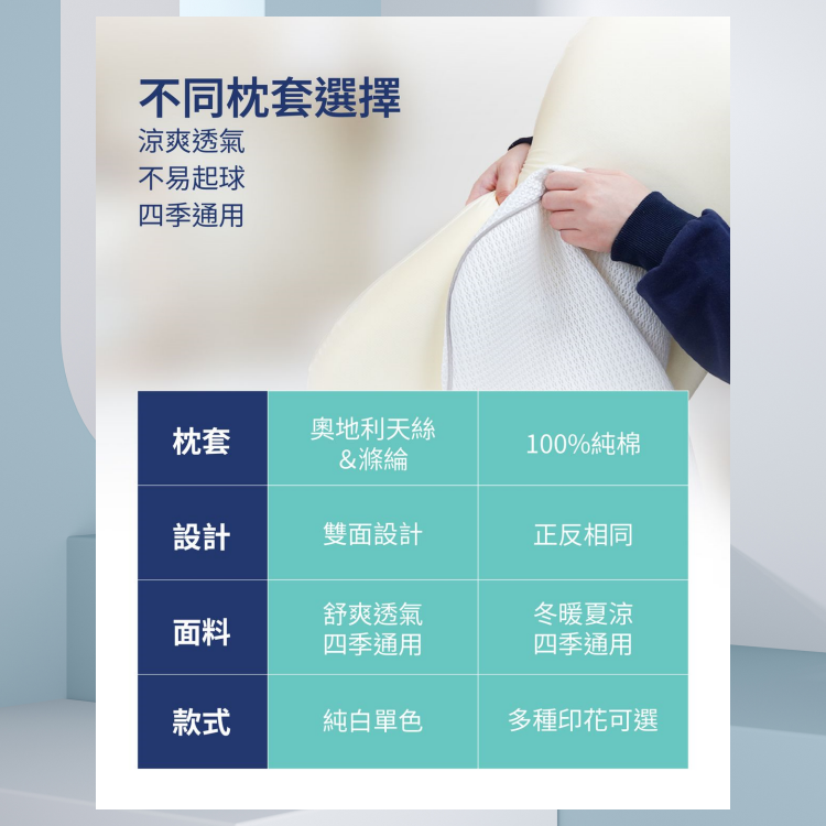 - 材質:100%可水洗枕芯(聚氨酯),抗菌防蟎內套(聚酯纖維),枕套(全棉+聚脂纖維)