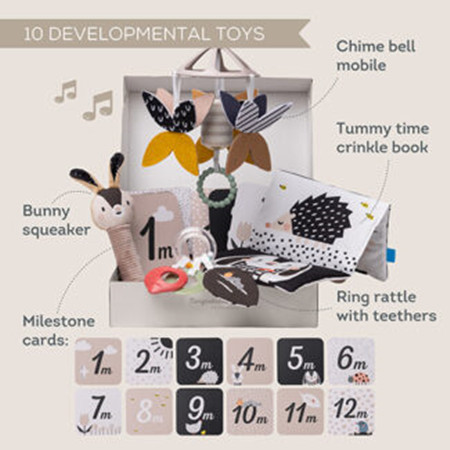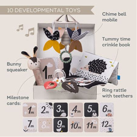 - 套裝包含10個種必備的新生兒發育玩具,一本黑白皺紋書、帶牙膠和皺紋葉的圓形玩具、