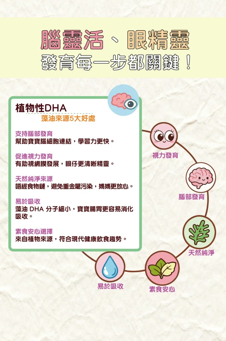 - 添加植物性 DHA(藻油)、維他命B1 及高膳食纖維,營養均衡又健康