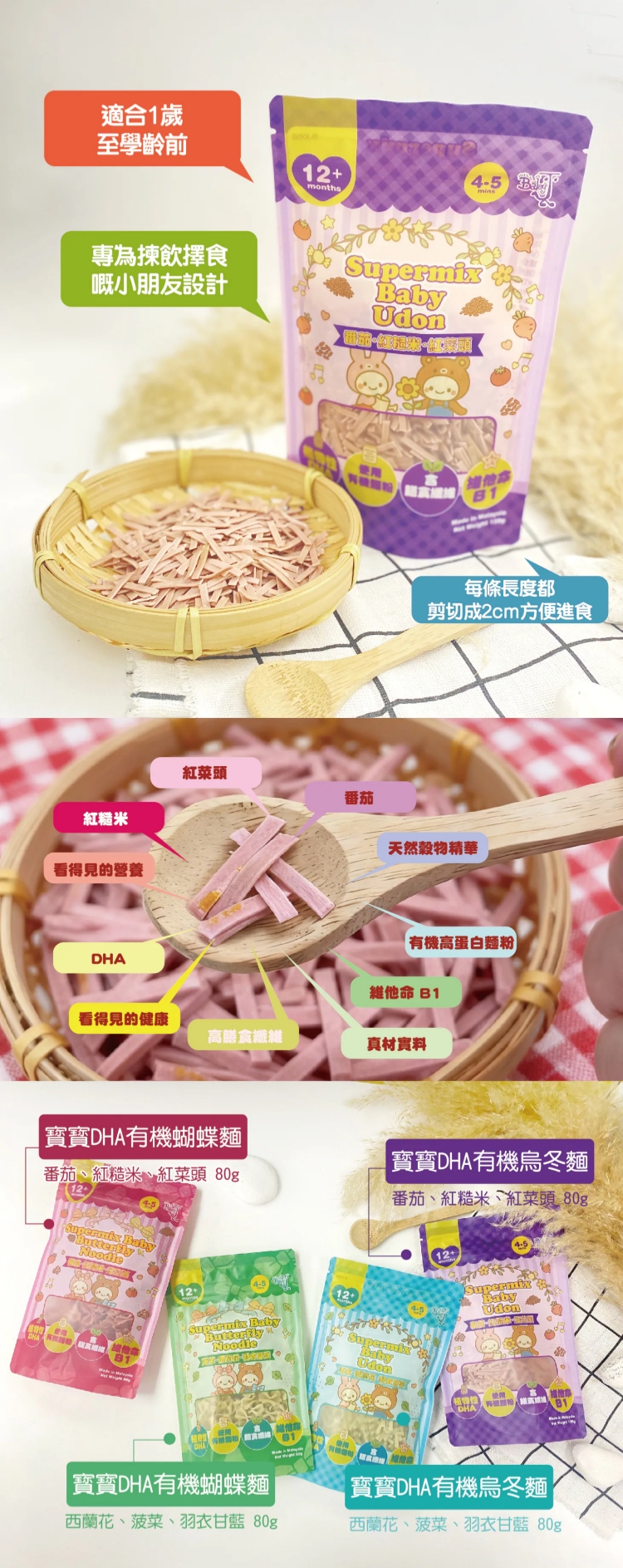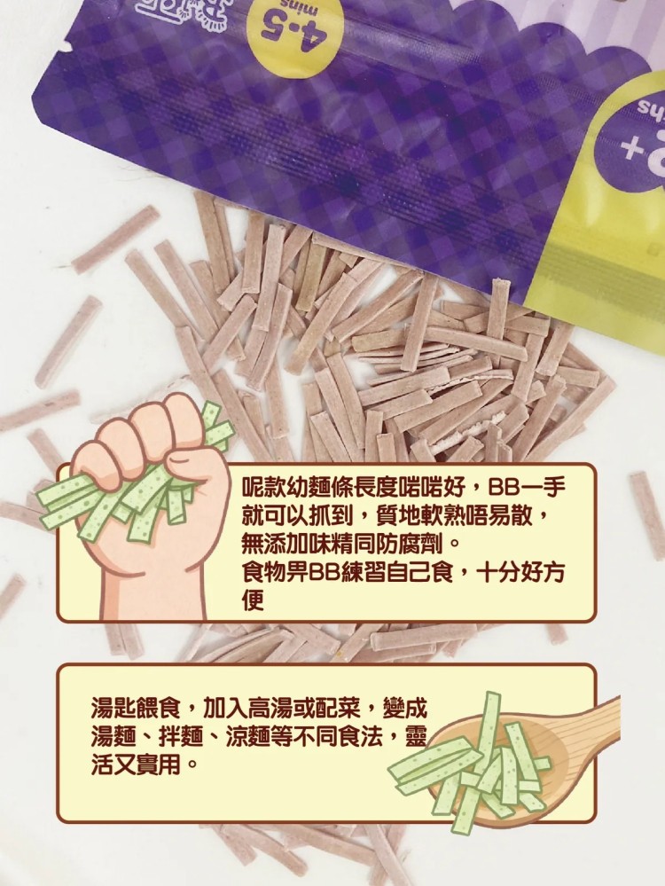 - 4–5分鐘即煮即食,口感軟滑易咀嚼,專為12個月以上BB設計