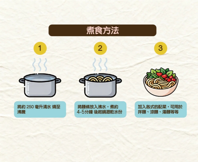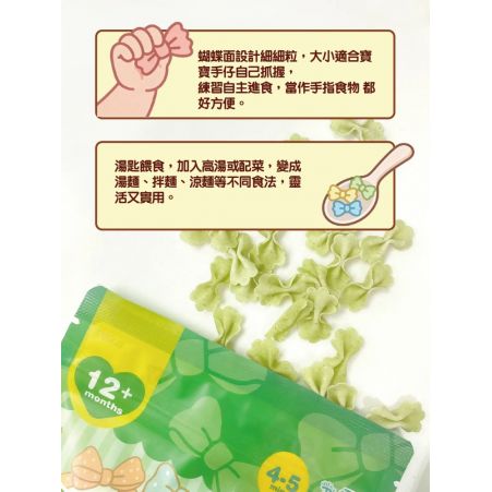 - 4–5分鐘即煮即食,口感軟滑易咀嚼,專為12個月以上BB設計
