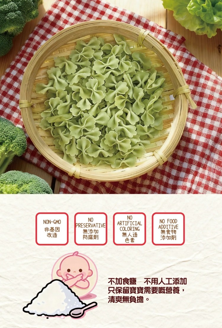 - 採用有機高蛋白麵粉製作,高蛋白質是寶寶發育不可缺少營養,
