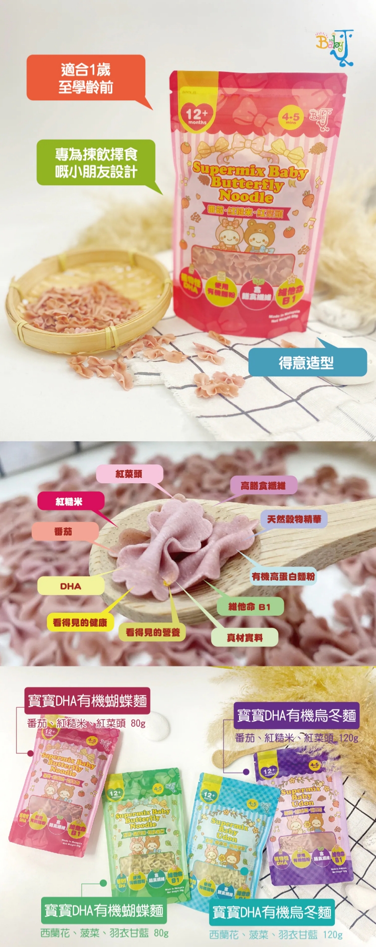 - 4–5分鐘即煮即食,口感軟滑易咀嚼,專為12個月以上BB設計