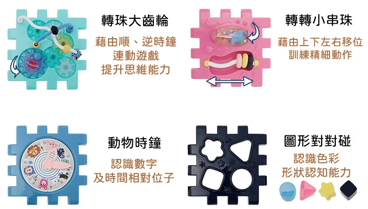 - 六面遊戲設計:整合觸覺、視覺、聽覺,提升手眼協調、大小肌肉與認知力