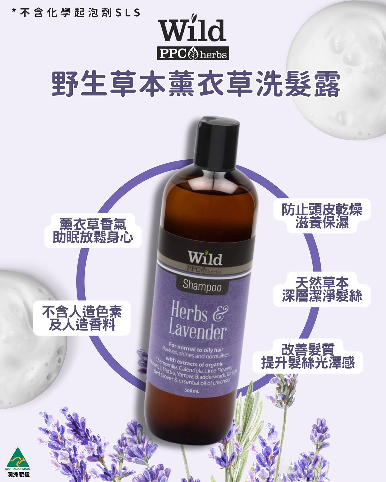 取適量塗抹在濕髮上,輕搓至起泡沫並徹底沖洗。要達到最佳效果,建議配合PPC HERBS野生草藥薰衣草護髮素使用。