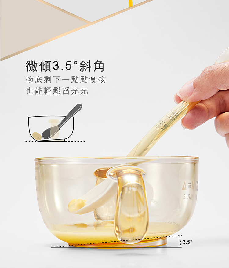 - 微傾3.5度智慧碗底,最後一口殘餘也能輕鬆舀起不浪費